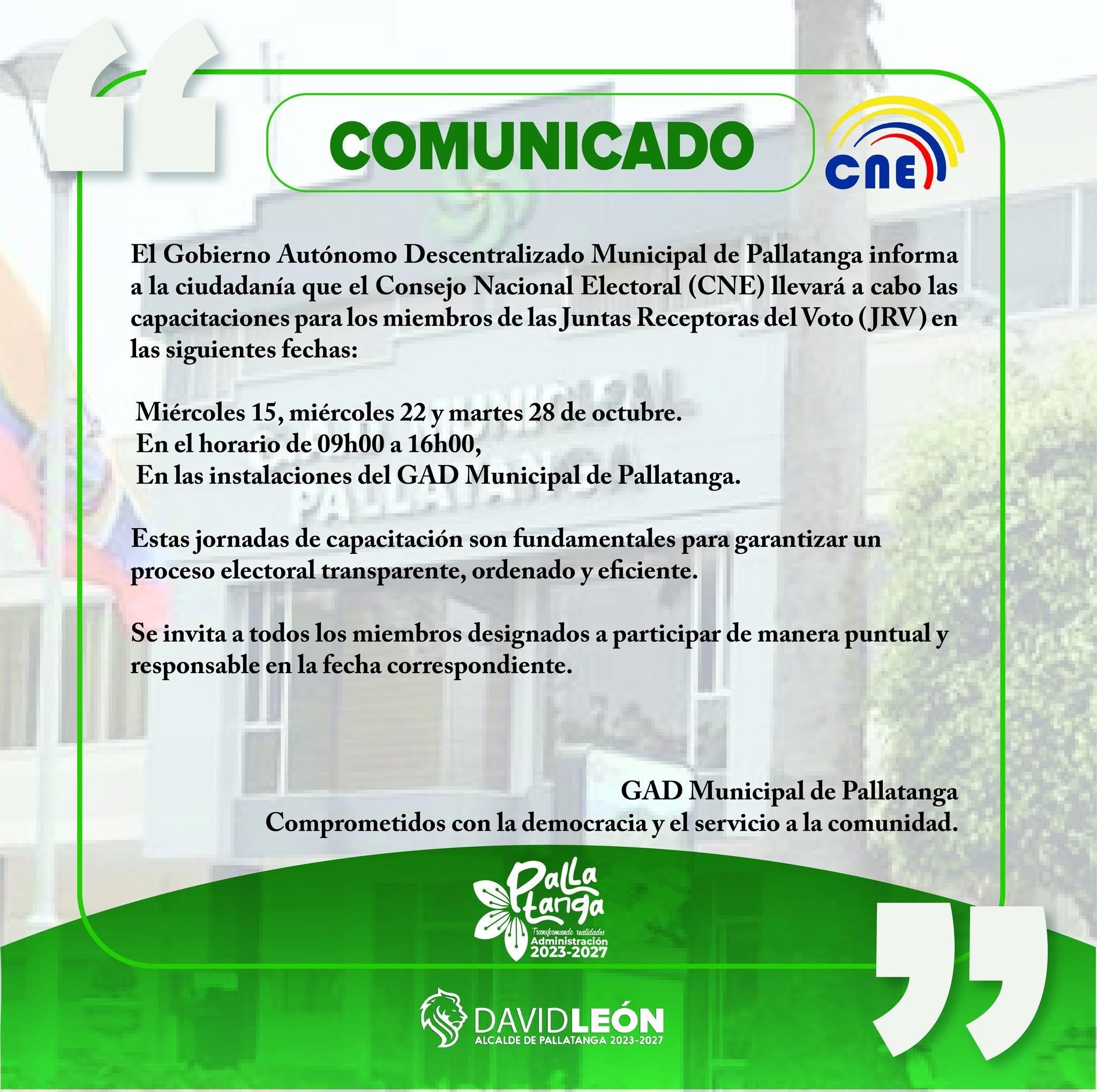 Bajo la administración del Sr. Jorge David León González (período 2023 – 2027), el Gobierno Autónomo Descentralizado Municipal de Pallatanga orienta sus esfuerzos a fortalecer la gestión pública local, promoviendo el desarrollo planificado, sostenible e inclusivo del cantón. Su compromiso se centra en transformar realidades mediante obras, programas y servicios de calidad que impulsen el bienestar social, el crecimiento económico y el progreso de todos los pallatangueños